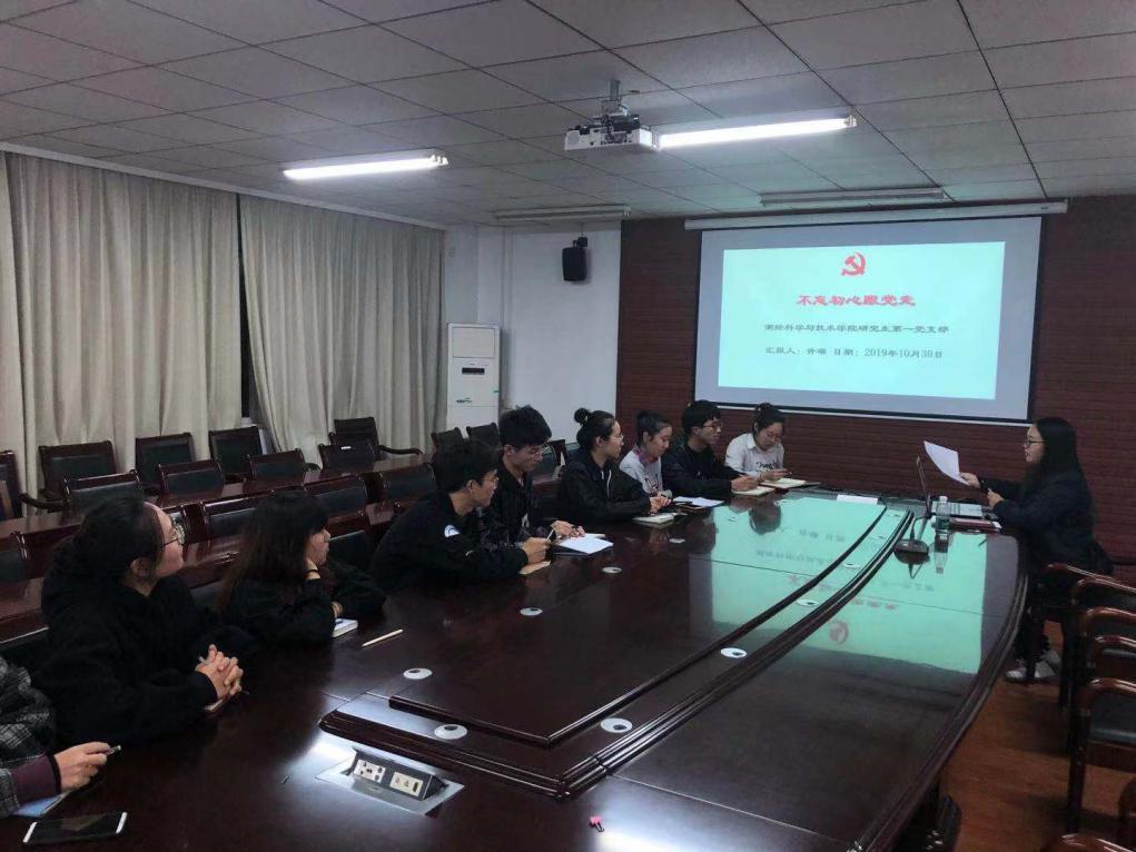 2019年10月30日晚7:30,我院研究生第一党支部开展“不忘初心”主题党课、党员自评集中研讨活动。本次活动在江浦校区天工楼会议室举行,由党支部书记许琳同志主持,学院全体党员参加会议。