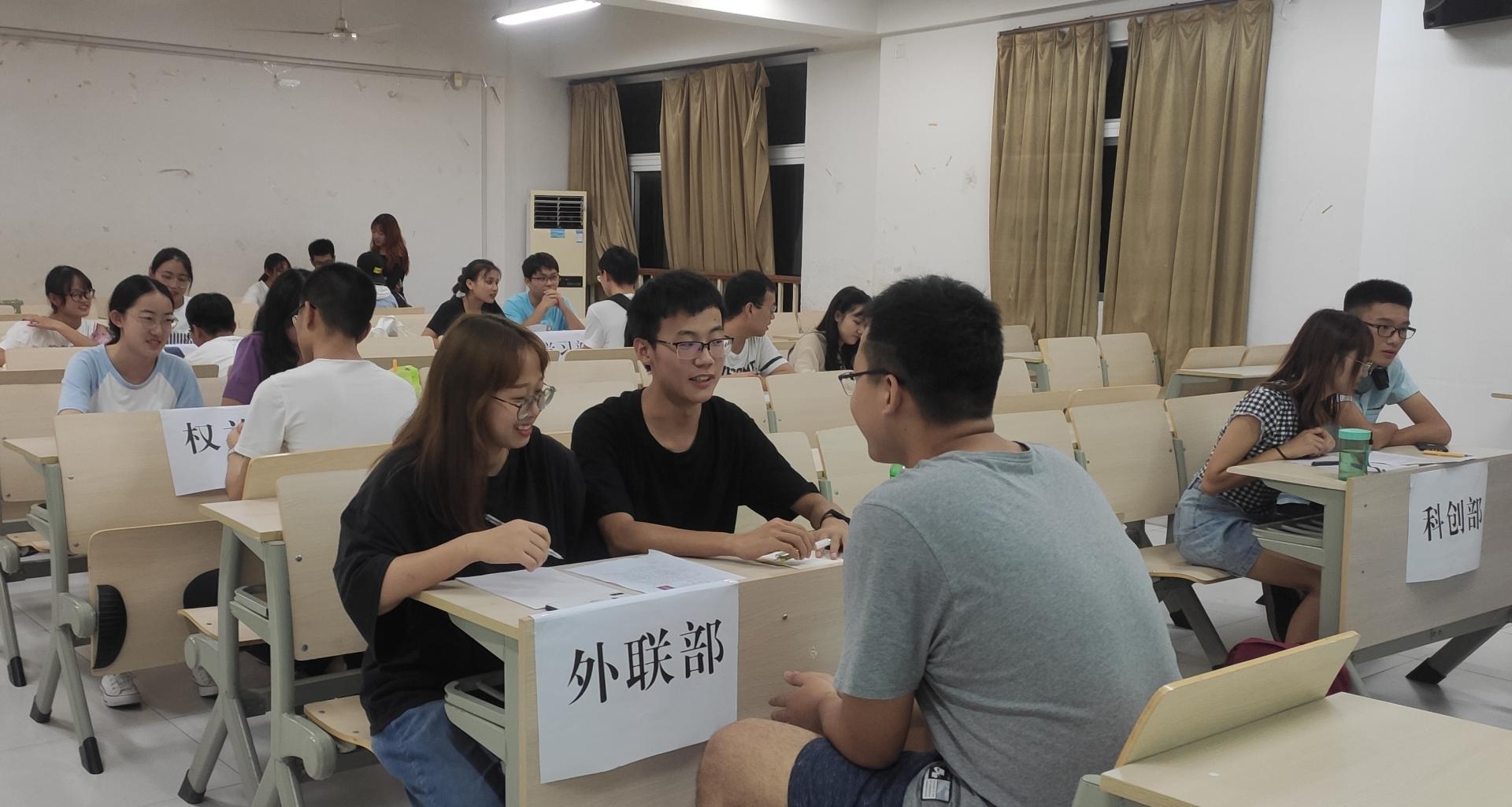 会议伊始,学生会主席陈世通对2019级学生的到来表示热烈欢迎,他综合概述了学生会的主要职责与以往举办的各类活动,指出学生会是一个温暖的大家庭,给了学生自我展示和锻炼能力的平台,并表示期待他们的到来。之后,八大部门以及团总支、创业与就业协会、心理协会和院辩论队分别从部门成员、部门职责、部门发展等多方面介绍了自己的部门,精彩的PPT及幽默轻松的演讲方式带动了2019级新生的积极性,同学们表示会积极参与其中。晚上7时各部门分别对新生进行面试,在了解了学生意愿并讨论交流后,活动圆满结束。
