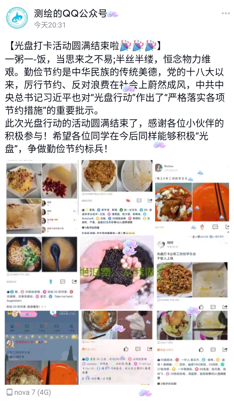 活动收到众多同学的点赞,被很多同学转发,本次活动影响广泛,既提高了我院学子的节俭意识,也为光盘公益行动助力,为建设文明先进和谐的社会,贡献了当代青年大学生的非凡力量。