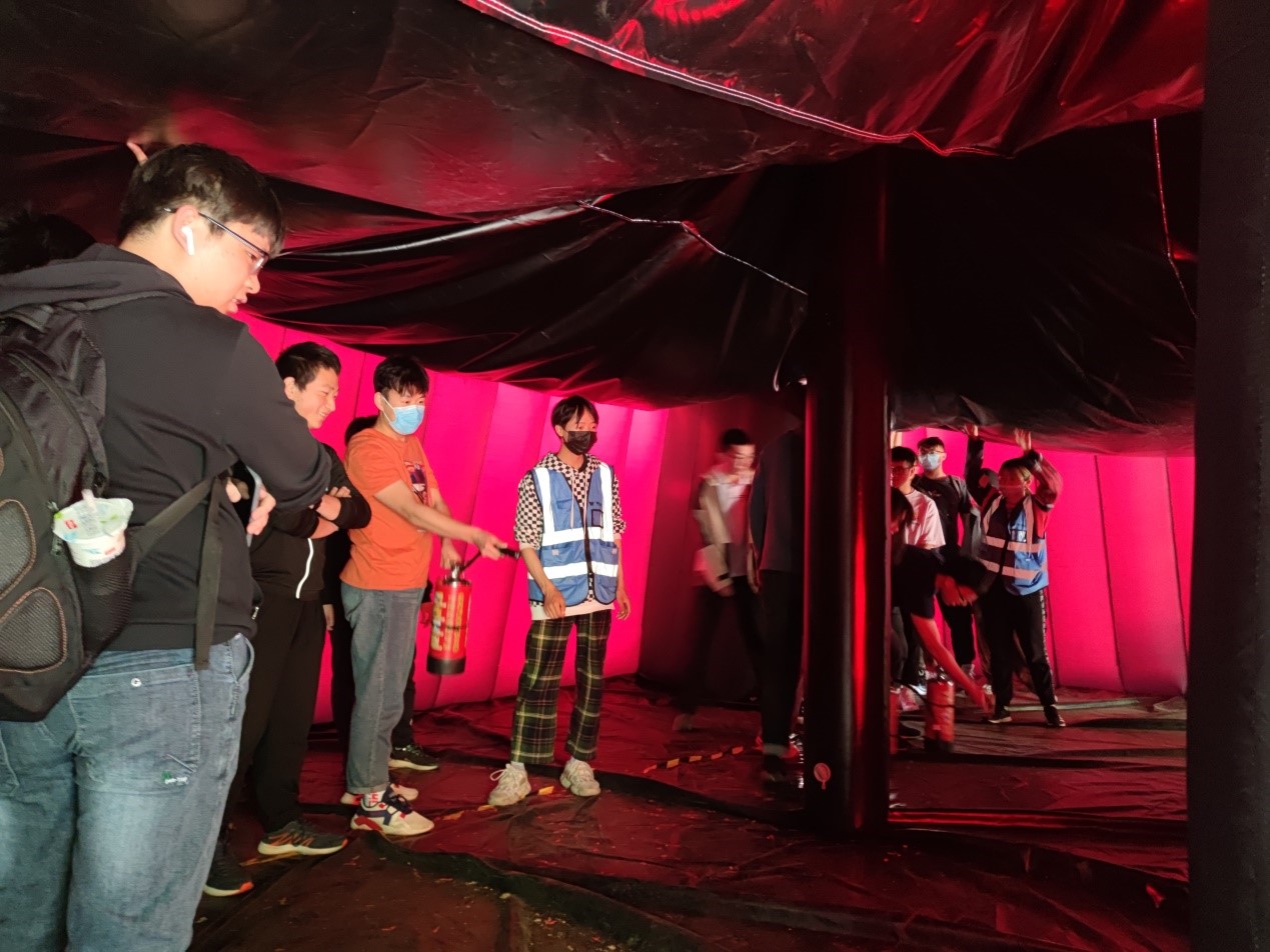 此次“消防演练体验”活动分为理论知识学习、模拟灭火、模拟逃生三个环节。活动伊始,现场负责老师向同学们介绍了消防安全的基本常识。随后,演练负责老师就几种不同种类灭火器的正确使用方法进行了现场讲解、示范、指导。同学们在现场工作人员的指导下,尝试使用灭火器,并成功“扑灭”火焰。另一侧的“火场逃生”演练环节,高度还原了火场中烟雾大、能见度低的恶劣条件。现场负责老师教导学生采用正确的逃生姿势,躲避障碍物,“逃”出“火场”。