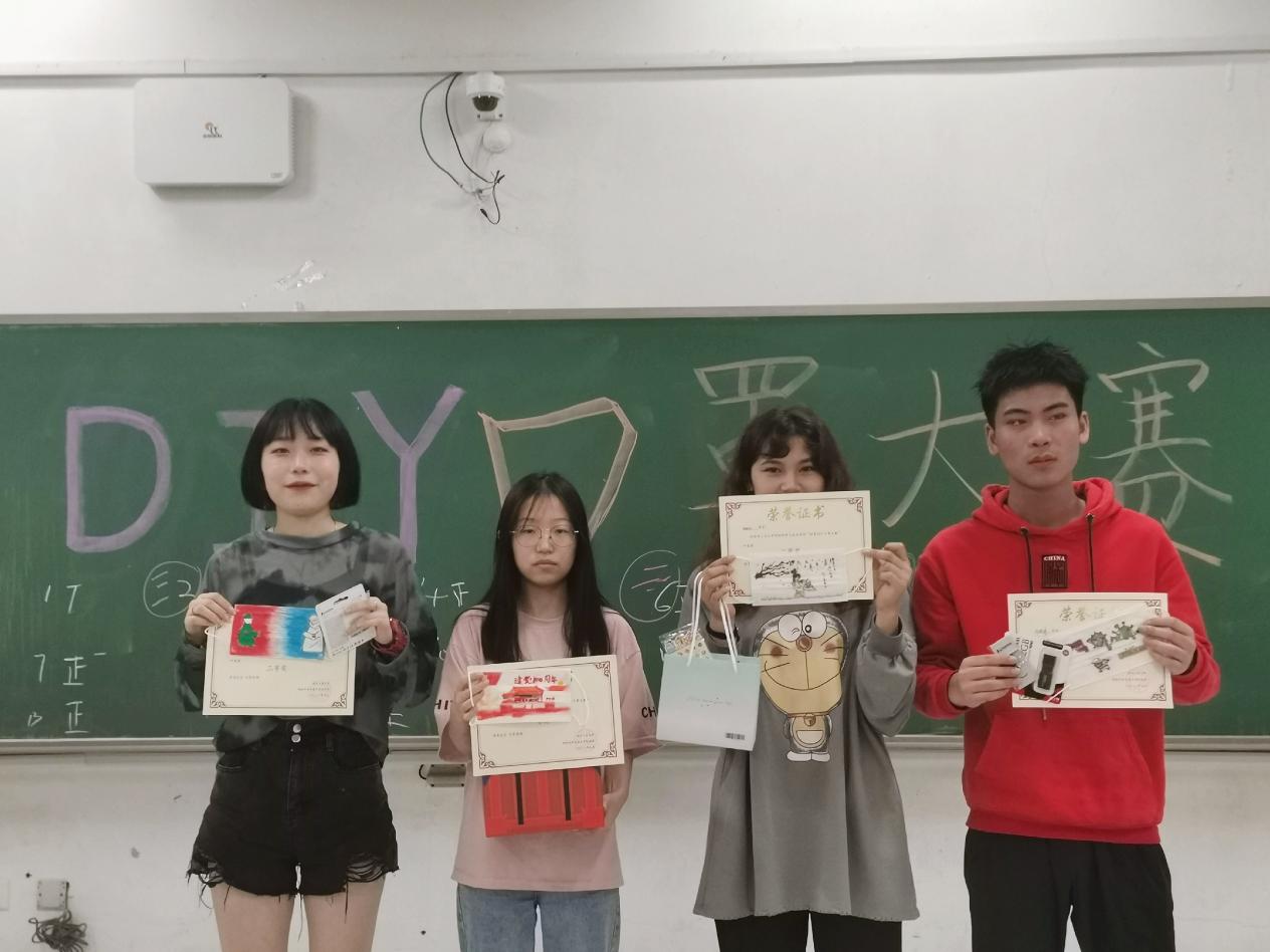 比赛开始前15分钟,参赛同学进入教室,领取比赛物资。18:30比赛正式开始,每位参赛同学有30分钟的时间进行创作。在比赛时间内,同学们发挥自己的想象力,将头脑中的精致创作,用画笔在口罩上留下了一幅幅生动有趣的图案,创作内容包括回望新冠疫情、庆祝中国共产党成立100周年、可爱的表情包等众多方面。经过作品展览、选手互投、现场唱票,最终地信1901班的李书雅摘得桂冠、测绘2001班的米合热古丽荣获二等奖、测绘2001班银措吉和测绘2001班邓洪涛取得三等奖。最后,全体参赛选手戴着自己口罩合影留念,活动圆满结束。