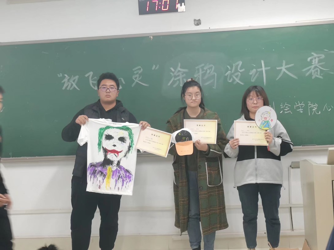 本次涂鸦设计比赛的主题是“放飞心灵”,参赛同学需要在指定物件上进行涂鸦色彩的设计,绘制属于自己独一无二的艺术作品。赛前,同学们在工作人员处领取绘画颜料,绘画载体则没有限制,有白T恤、白帽子、白扇子等等。经过一个小时的团结协作和不懈努力,一幅幅五彩斑斓绚丽多彩的艺术品呈现在我们眼前。比赛的尾声,老师评委们对参赛作品进行了详细点评和指导,肯定了学生们的自我动手能力、丰富了学生们的艺术赏析能力。大赛的最后举行了颁奖仪式并作合影留念。