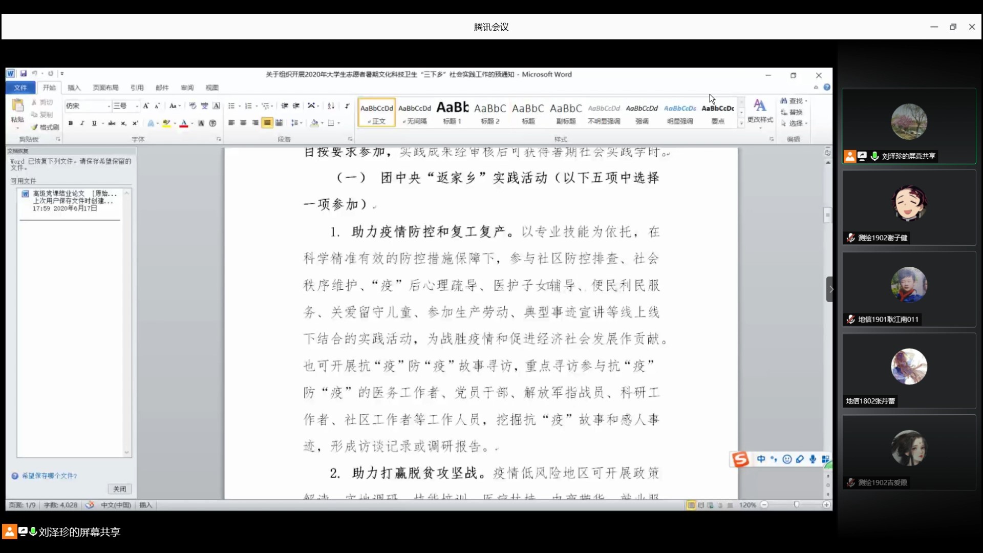 首先,刘泽珍详细地解读了暑期社会实践有关要求和说明,并对其中需要特别注意的方面进行强调。接着,2018级的几位同学分享了暑期社会实践经验。地信1802班周曹晨宇同学着重强调了团队之间分工合作的重要性,他表示每位成员都要明确自己的工作,高效率完成任务;地信1802班唐英凯同学则重点介绍了社会实践报告书的内容书写技巧;地信1801班张佳卉同学建议暑期社会实践应分阶段有序开展,以确保工作进行顺利。最后,张甲田老师建议同学们采取线上线下相结合的方式来完成这次暑期社会实践活动。许琳老师做出总结,并鼓励同学们积极参加暑期社会实践。