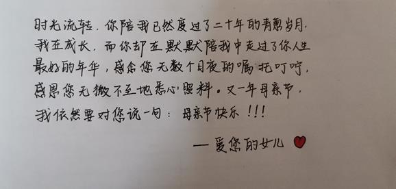 本次活动形式多样化,可采取视频、海报、照片等多种形式提交作品,作品内容包含帮母亲做家务、为母亲展示才艺、写几句感恩话语等,本次活动还加入了“岁月从不败美人”环节,可自愿提交母亲多年前与如今照片。自活动发起以后,我院同学们积极参与,公众号收到许多投稿,余冰鑫同学别出心裁,亲手为母亲制做发饰,齐梦轩同学提交了与母亲的合影,更有谢子健等多位同学用劳动感恩母亲…感恩的方式有很多种,用心去感恩母亲,就是在这一天送给母亲们最好的礼物。