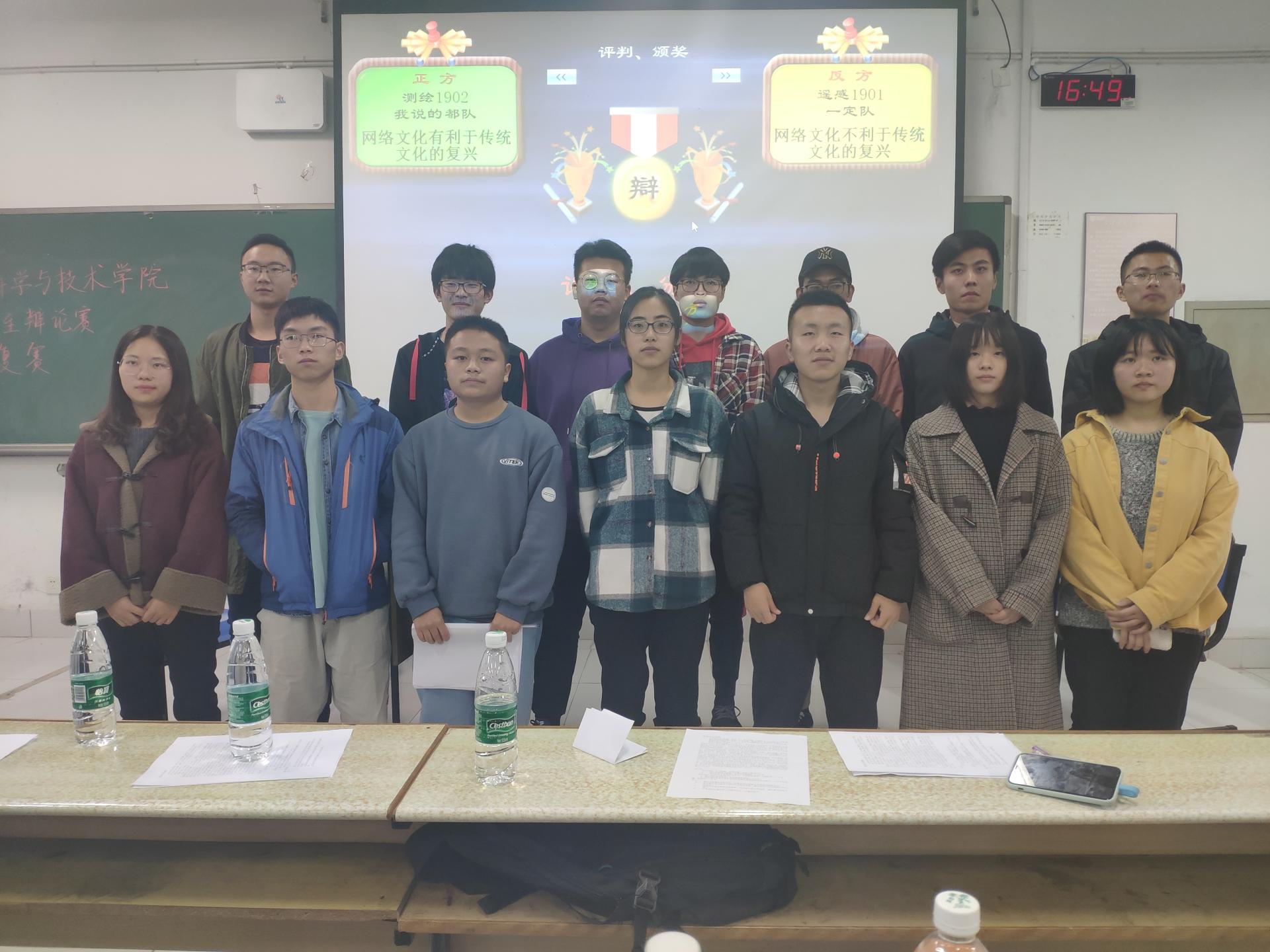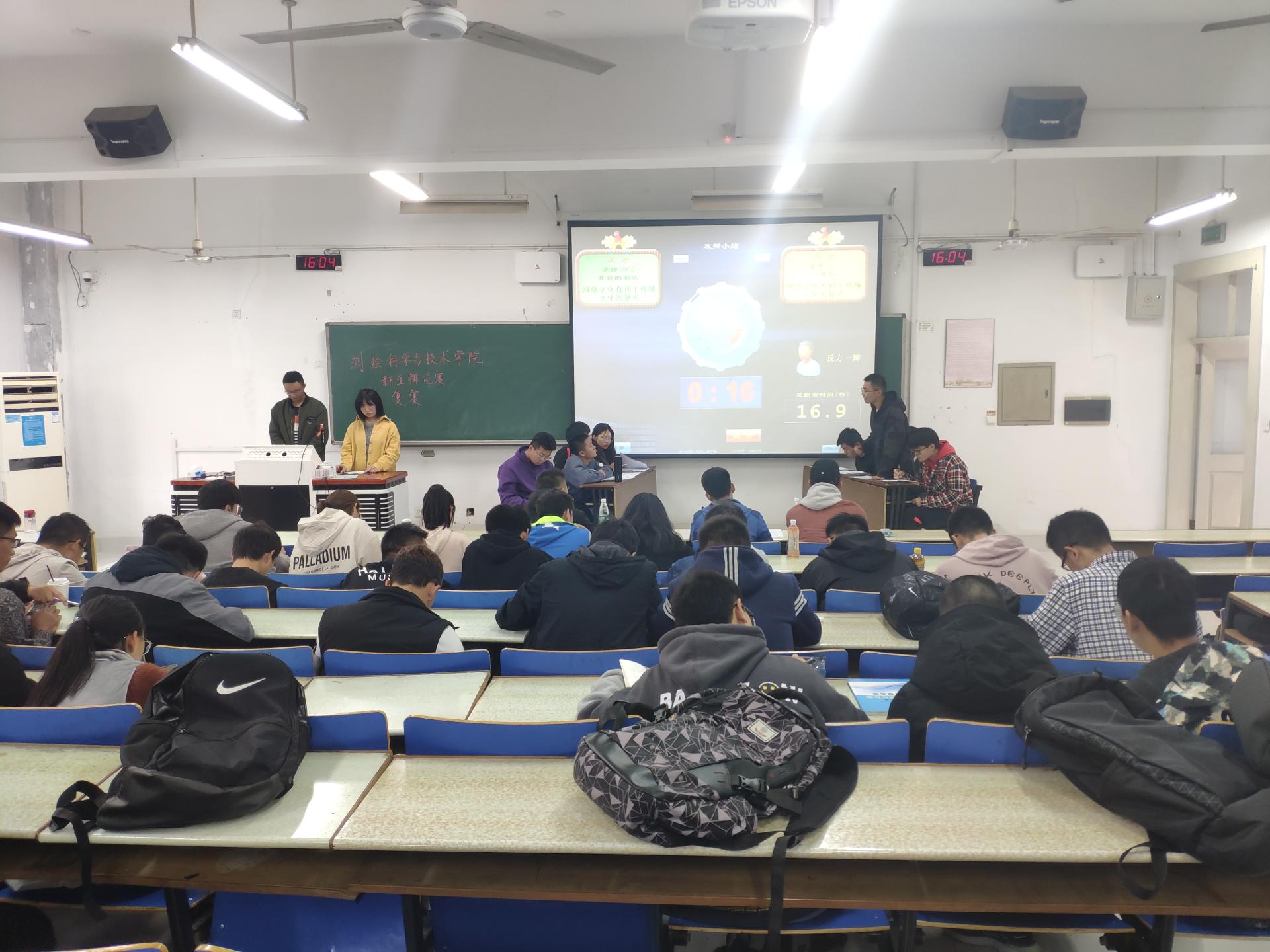 双方辩手围绕“网络文化是否有利于传统文化的复兴”这个辩题展开激烈辩论。本次比赛双方辩手赛前都做了充分准备,正方一辩从网络文化定义说起,联系生活实际,坚持认为“网络文化有利于传统文化的复兴”;反方一辩分点论述,通过对现实的剖析,坚持“网络文化不利于传统文化的复兴”的立论。在之后的攻辩、自由辩论、总结陈词环节,双方辩手引用贴近生活的实例,以精彩的表现使得现场气氛活跃。辩论结束,在四位评委的认真讨论后,徐全学长指出了两队在比赛中的不足之处以及改进方法。最后,来自测绘1902的正方三辩摘得“最佳辩手”之称,反方遥感1901取得胜利,成功晋级下一轮比赛。