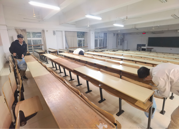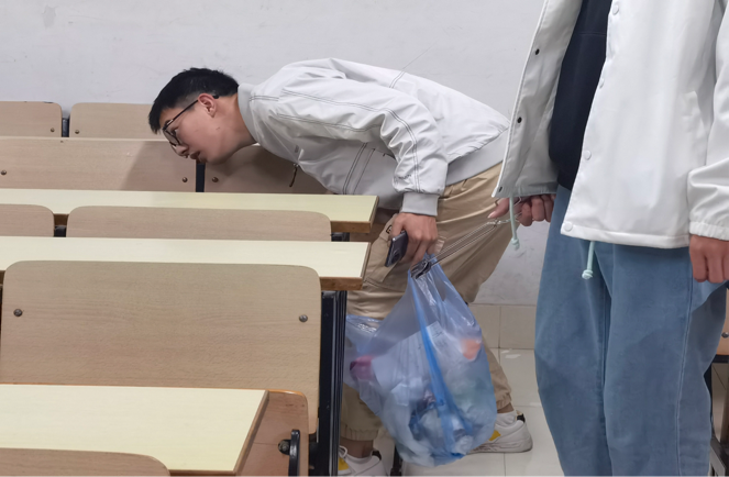 活动前,学院全体学生利用线上、线下多种方式进行宣传,提升学生环保意识并招募卫生检查与卫生开展两类志愿者。活动中,志愿者们对晚自习后的教室进行清理,包括抽屉内垃圾清理、地面清扫和黑板等进行清洁。卫生检查志愿者对自习室同学进行监督,若发现其未自觉带走垃圾,则对其进行教育引导,培养学生们的环保意识与自觉性。
