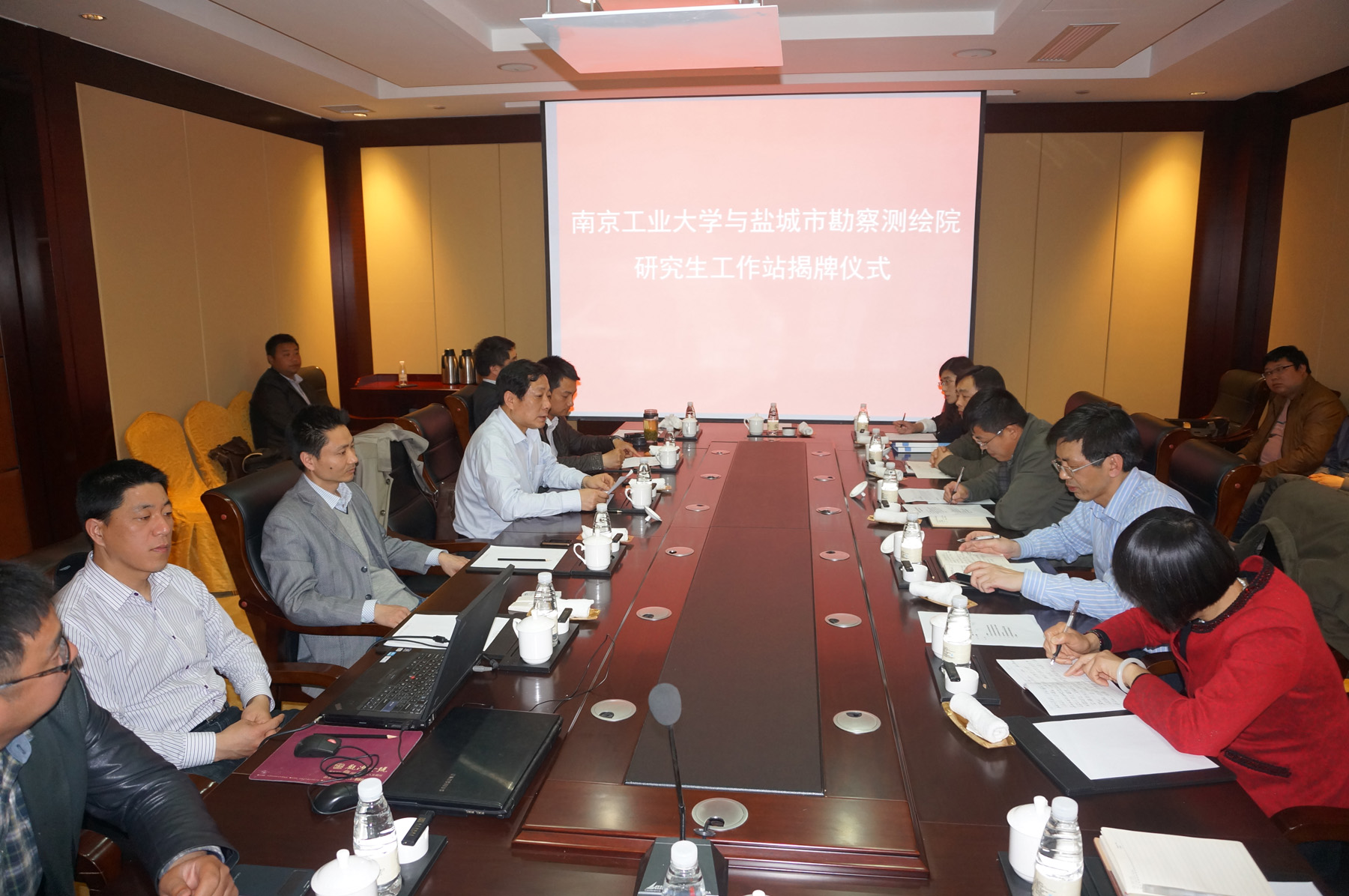 最后,段然堂书记在总结中表示,盐城市勘察测绘院研究生工作站揭牌是校企双方长期产学研合作的深化,是双方进一步加强共建的重要平台和载体;工作站承载着校企合作研发、人才培养和共同申报课题的任务,合作双方各具优势,有很多合作共赢的结合点,合作的空间和发展的潜力巨大,今后需要双方细化工作站的建设目标及推进计划,充分发挥双方在市场、资金、技术、人才、学科和科研的优势,实现合作共赢。