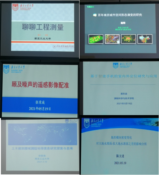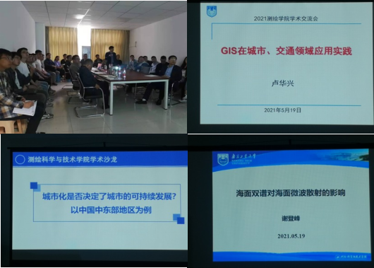 徐敬海院长率先为本次学术交流活动开讲,做了题为“土木建筑领域测绘地理信息研究探索与思考”的学术报告,结合实际的工程和科研项目,分享了测绘地理信息在实际工程领域应用方面仍存在的问题和挑战。随后,吴东金、谢登峰、石银涛、卢华兴、李海星、陈文进、张荣庭和施歌等九位老师详细介绍了智能手机室内定位、海面微波散射特性、什么是工程测量、GIS及其在智慧城市中的应用、生态环境与城市化水平耦合关系、大地水准面与似大地水准面确定、遥感影像配准、南京城市空间形态变化等各自研究领域的进展。