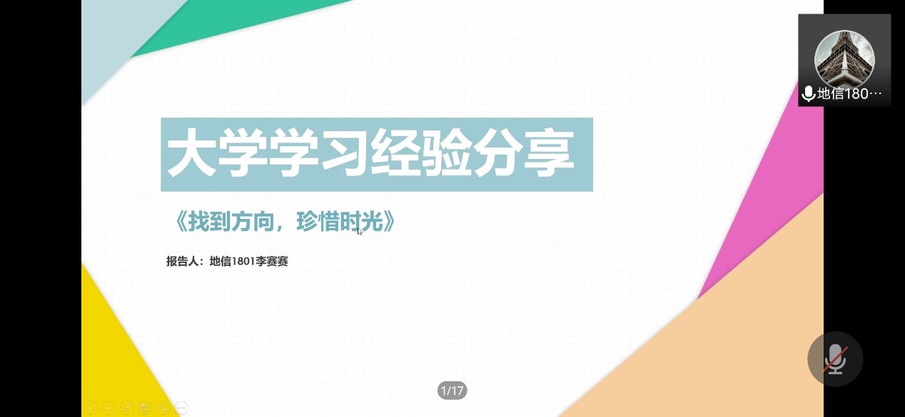 为帮助2021级新生更好、更快地适应大学生活,我院9月24日晚线上开展了优秀学长经验分享交流会。本次会议由遥感1901班储思敏主持,地信1801班李赛赛、遥感1901班聂聪和遥感2001班高伟晋三位同学主讲,全体2021级新生参加会议。