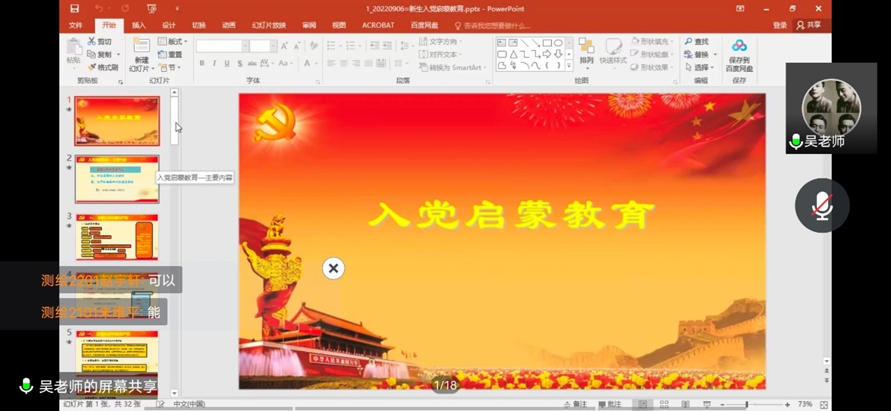 为帮助新生了解党的基本知识,明确入党动机,9月8日下午我院采取线上的形式举行了入党启蒙教育。学院专职组织员吴倩老师主讲,2022级全体新生参加会议。