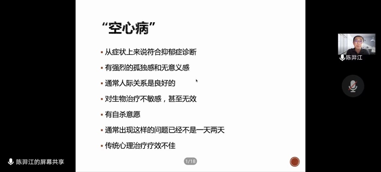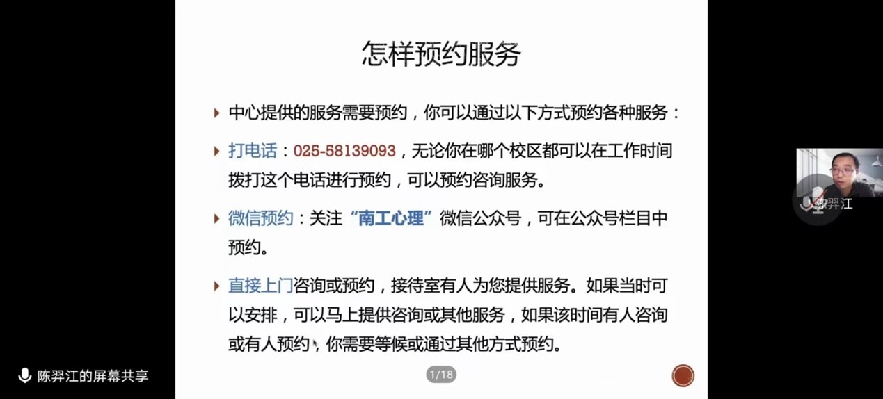 会议伊始,陈奕江老师由大学新生的身份转变谈起,介绍了大学新生健康的心理状态,讲解了身份转变的重点难点,用深入浅出的演讲为新生的心理转变作了专业指导。接着,他重点介绍了在大学生中多发的抑郁症,分析了其成因、危害,为同学们讲解了抑郁症和抑郁情绪的区别,并提出了应对不同状况的解决方案,如预约校心理咨询等。最后,陈奕江老师表达了对同学们未来的殷切期望和身心健康的祝福。
