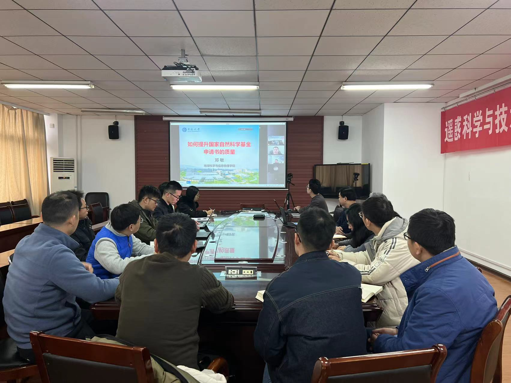 12月7日,中南大学地球科学与信息物理学院副院长邓敏教授应邀为我院教师作有关国家自然科学基金申报的线上讲座。院长徐敬海、副院长张广运和2023年拟申报国家自然科学基金项目的老师共同参加。报告会由徐敬海院长主持。