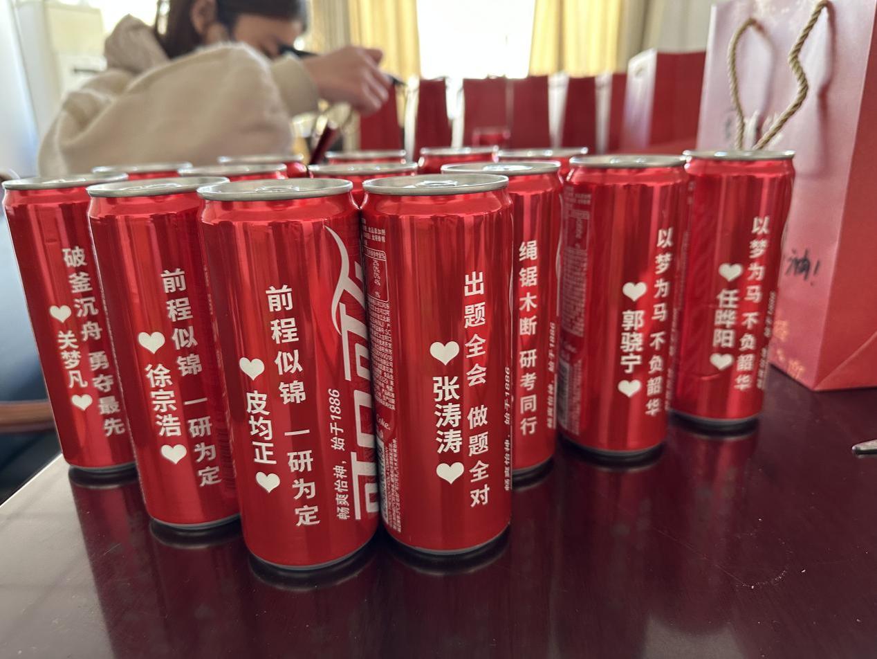 活动最后,学院为考研同学送上了考研慰问品,一份份由辅导员手写着考研成功的“加油包”里装满了学院师生对考研学子的满满爱心,有写有祝福语的定制可乐,有脐橙寓意“脐”开得胜,心想事“橙”,还有考场必备能量棒“士力架”等等,希望同学们感受到温暖。同学们收到暖心礼物后十分感动,大家纷纷表示,学院的关爱、老师们的祝福就是对他们最好的鼓励。