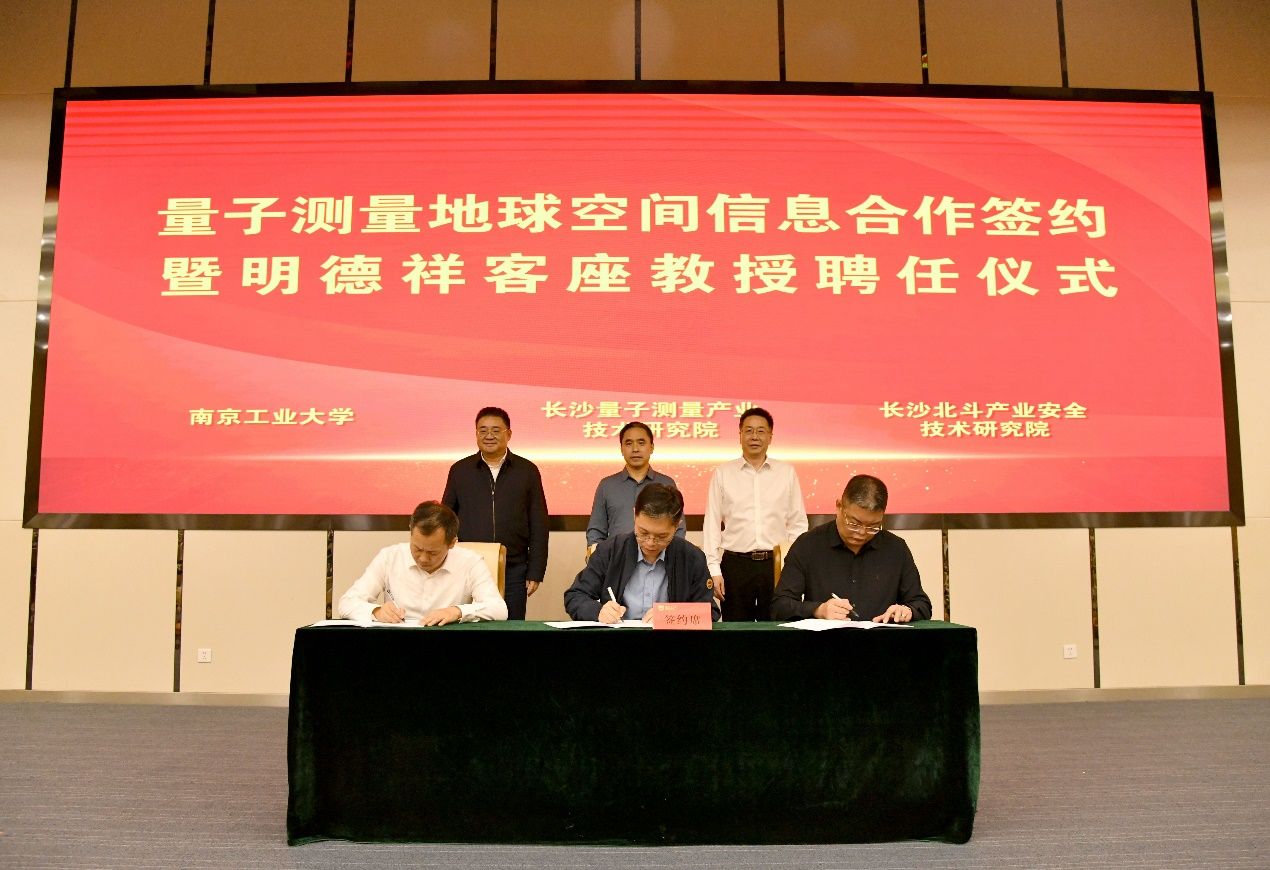 陆伟东副校长代表学校对明德祥董事长等嘉宾表示诚挚欢迎,期待三方合作能够为产教融合和校企合作树立典范,提供更多理论研究、实践经验和产业化成果。长沙量子测量产业技术研究院汪陶胜副院长、长沙北斗产业安全技术研究院左元洋部长和学校科学研究院陈红喜副院长代表三方签署量子测量地球空间信息合作协议。