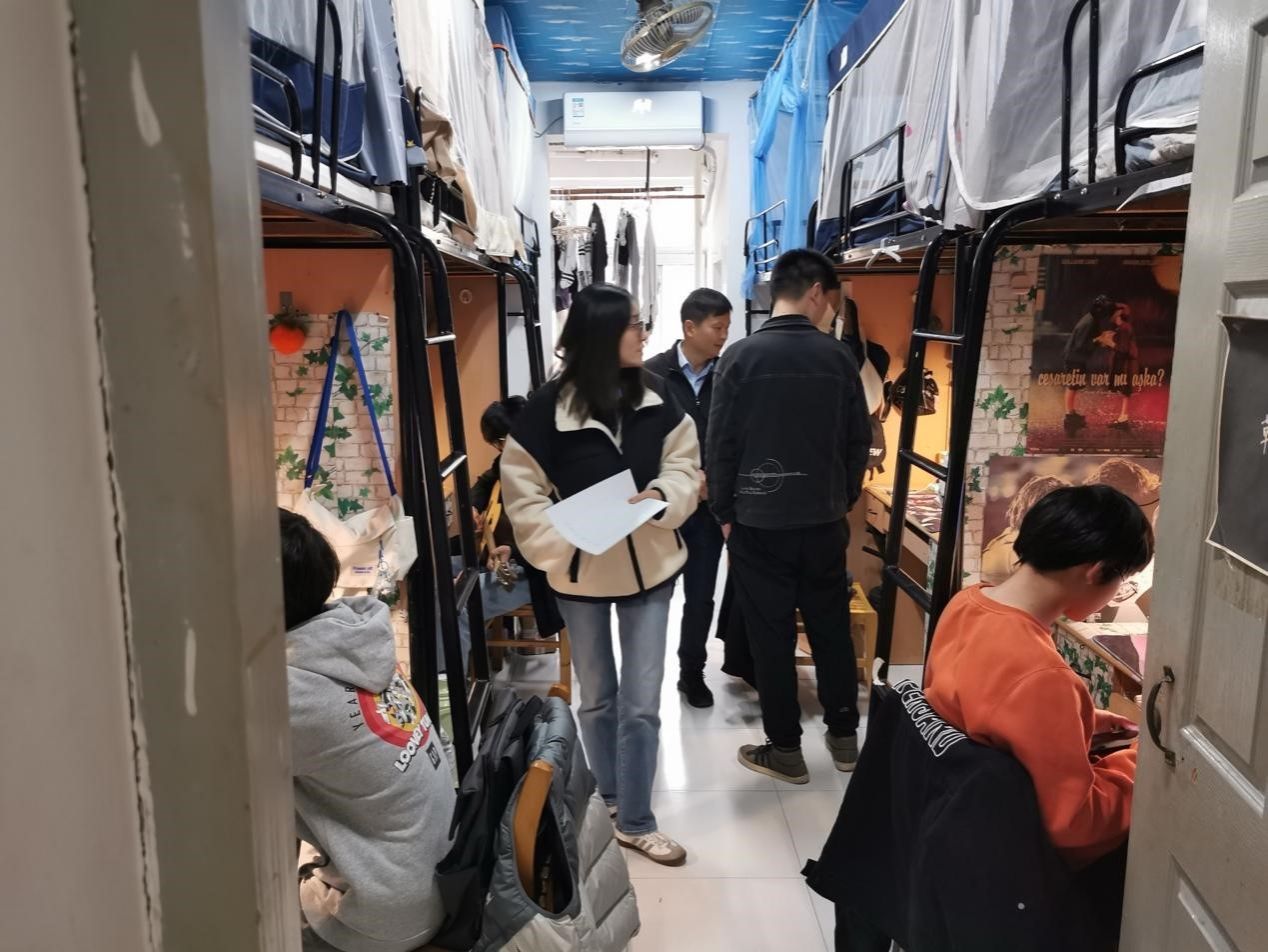 走访宿舍过程中,学院老师与同学们展开亲切交流。辅导员张甲田着重检查了学生的宿舍卫生并提出指导性意见。荣华伟副书记充分了解学生在校思想动态与生活、学习情况,引导同学们充分认识和谐温馨的宿舍环境和建立友好舍友关系的重要性,并提醒大家主动了解宿舍安全规范,自觉遵守校规校纪。此外,老师们还鼓励大家增强户外体育锻炼,调节身心状态,养成良好的卫生习惯,努力营造积极向上的生活氛围。