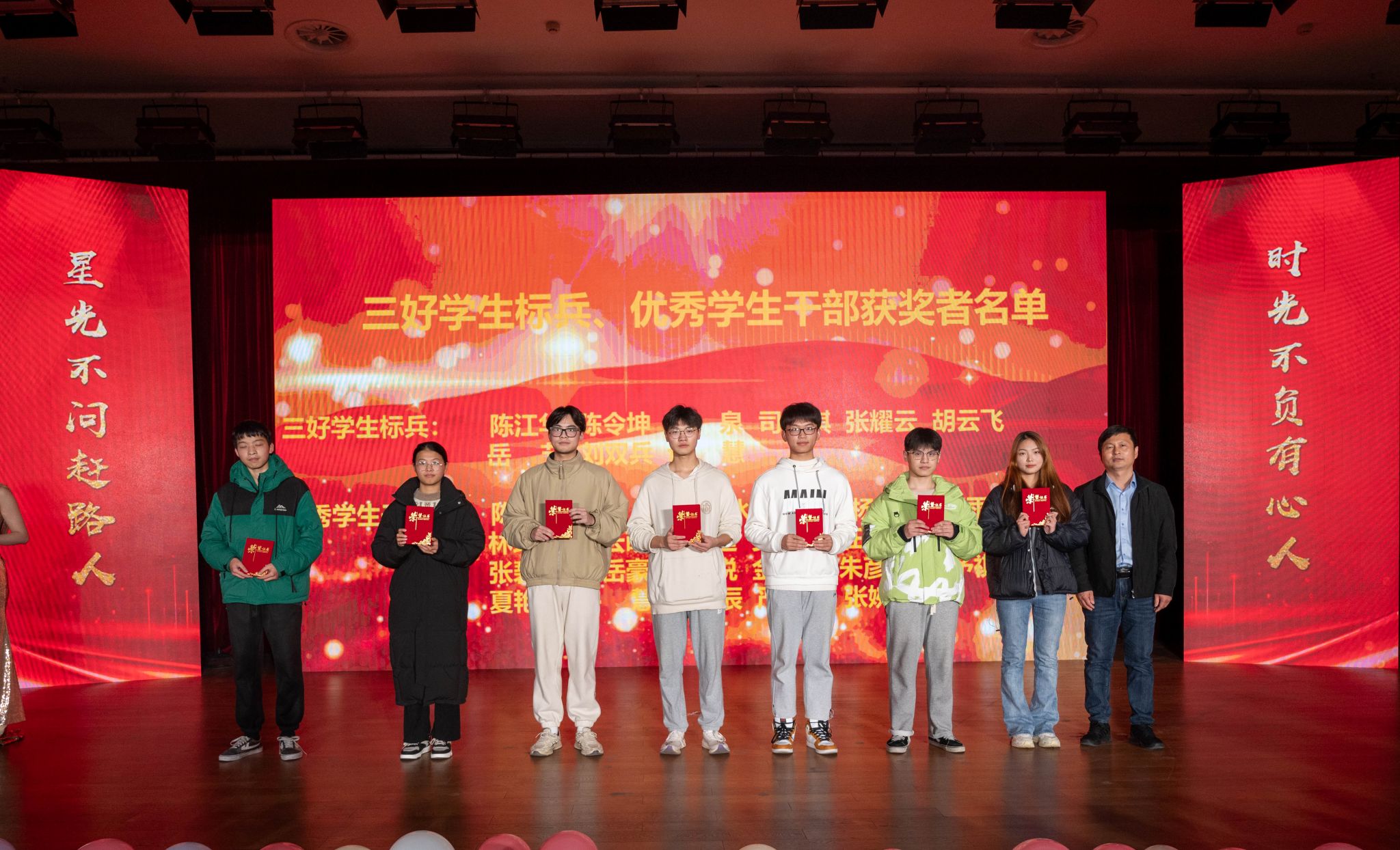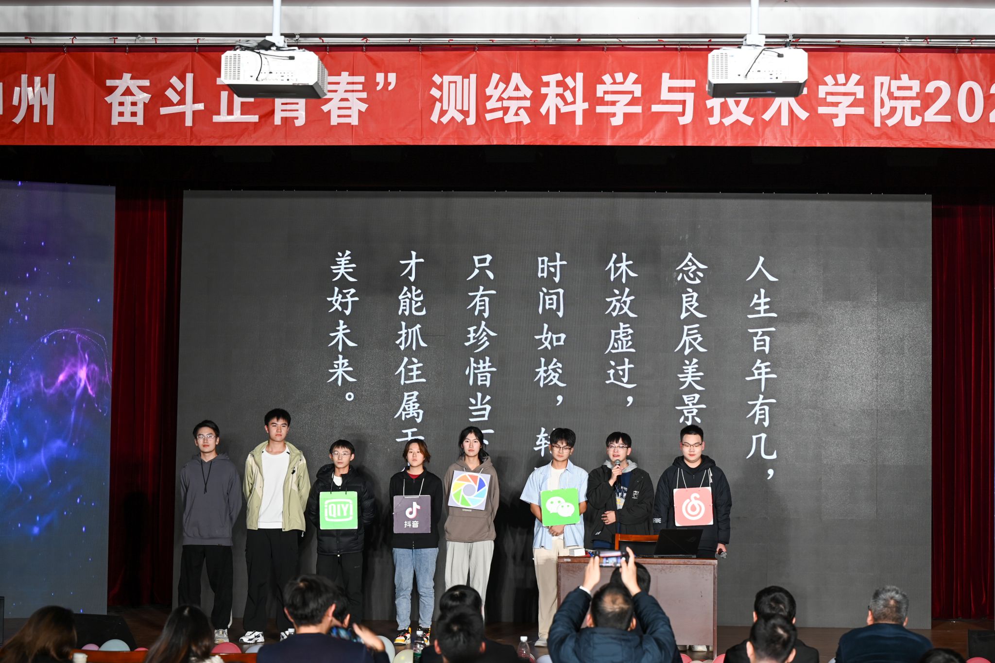 第二篇章“流光溢彩,放飞梦想”。以学院党委书记俞建光新生寄语开场,他希望大家明德励志,担当使命;以梦为马,破浪笃行;不负韶华,不负时代。测绘2301班姚才源同学作为新生代表分享了入学感悟,表示在未来的大学时光里将把人生理想融入国家和民族的事业,明德修身,发奋图强。遥感2002班陈江华同学作为青春榜样分享了自身学习成长的故事,鼓励学弟学妹们树立远大目标,实现社会价值,矢志爱国奉献,勇于创新创造。最后,“励志青春,测绘风华”颁奖典礼将全场观众气氛推向高潮。