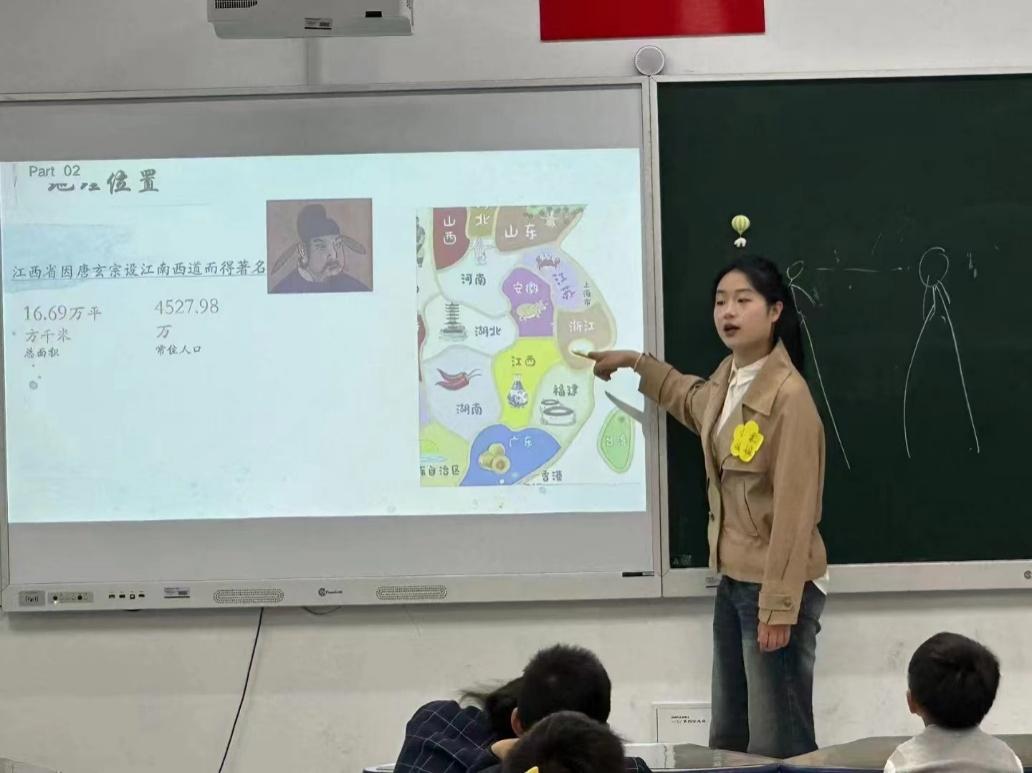 寻宝最后一站的小队长是来自我院测绘2301的肖瑾柔同学。她带领同学们乘坐热气球飞到了她的家乡江西。江西的山清水秀、山水如画曾让无数文人墨客在此留下千古绝句。小老师向同学们询问了关于江西的古诗词有哪些,全班同学大声背诵了李白的《望庐山瀑布》,一同感受诗词里的江西。此后,她带领大家走进景德镇,共赏我国四大名瓷,领略了中国瓷器发展的日新月异。如今瓷器不再只是隔着玻璃无法触碰的观赏品,随着陶瓷工艺的发展,市场上有了永不凋谢的陶瓷小花、陶艺小手链、摆件等各种各样的工艺品。