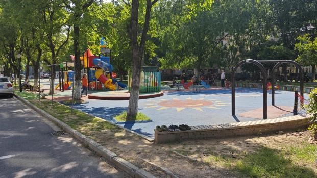 在江书记和社区工作人员的带领下,我院师生参观了儿童友好社区试点——珍珠花苑。此小区虽为老旧小区,但在社区工作人员的精心布置下呈现出多种儿童友好元素。小区塑胶地面上有丰富的儿童涂鸦,随处可见儿童手绘的七彩围栏,颜色各异的轮胎里种着鲜艳的月季花,儿童活动广场上还有滑滑梯等游乐设施,可谓将“儿童友好”元素根植小区每个角落。