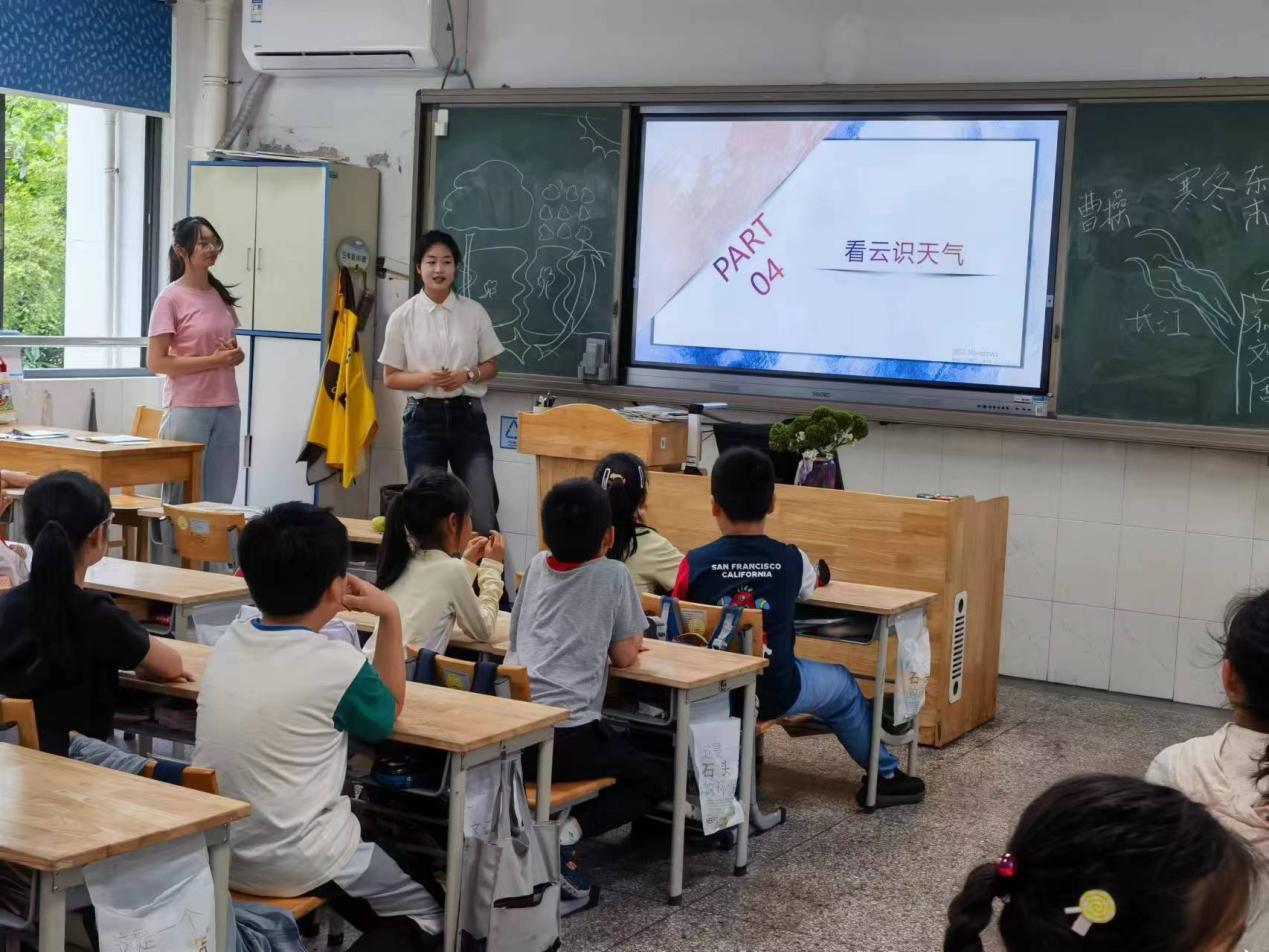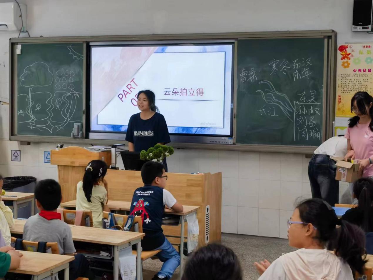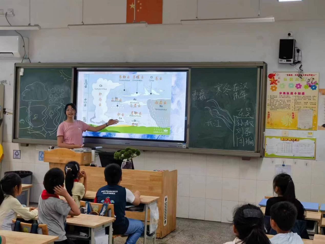 6月5日,我院地空2301陶潇雨、测绘2301肖瑾柔、遥感2302赵雨彤三位同学在吴云清、张甲田老师的带领下来到南京市天正小学开展“方圆地理——带小学生漫游地理世界”为主题的大创活动。这是我院师生继第一次“山春山”趣味课堂后,第二次走进小学。本次活动以趣味课堂与创意手工的形式展开,我院三位学生化身为追云小队长,带领小学生们遨游云海,探秘看云识天气的地理技能,激发同学们对自然地理的兴趣,让小学生感受自然、热爱自然。