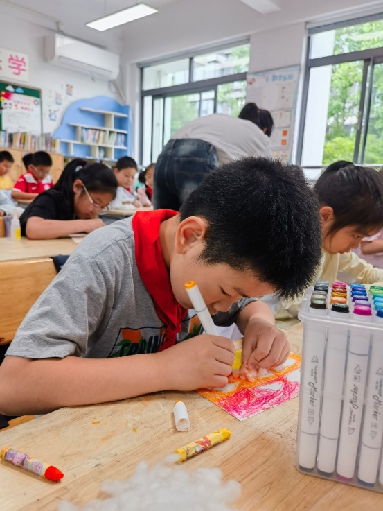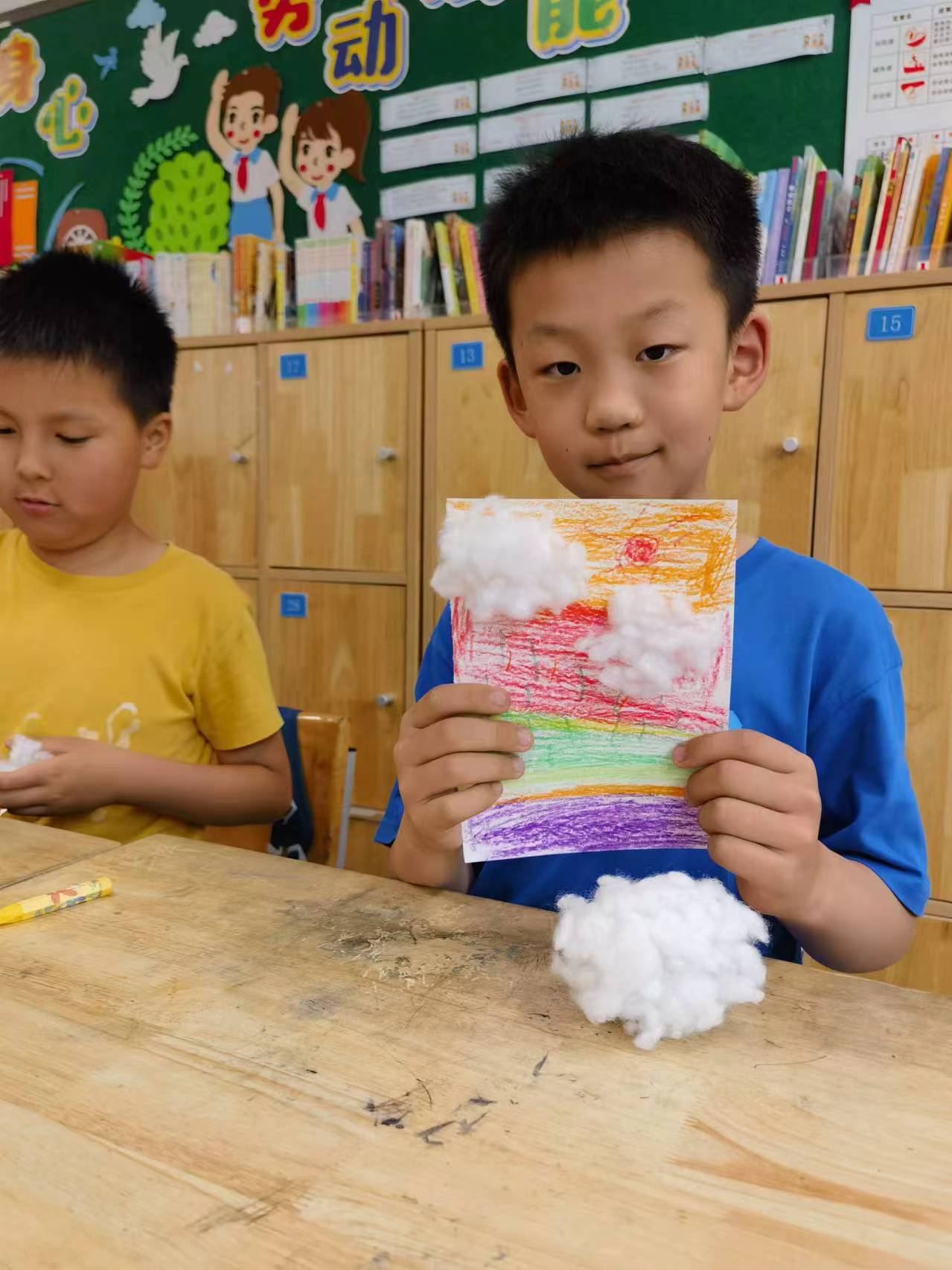 学习了理论知识后,课堂进入创意动手环节。本环节由我院赵雨彤同学介绍制作云朵拍立得的材料与方法。学习了制作方法,同学们先用蜡笔绘制了炫彩的天空,再将棉花揉搓成了云的不同形态,最后用胶水粘到了画纸上,这样就做成了一幅独一无二的云彩画。动手时,同学们迸发了各种奇思妙想,有的制作了蘑菇云,有的画了火烧云,有的堆积成了立体的云朵,各式各样,千奇百怪。制作完成,同学们也积极分享了自己的创作理念和成果图。听了同学们的分享,我院师生都感受到了自然地理对小学生的魅力和同学们丰富的创造力。