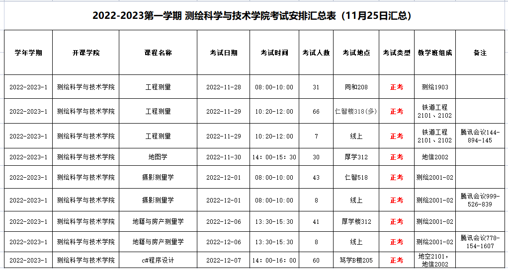 2022-2023第一学期yL23411永利官网登录考试安排汇总表(11月25日汇总)