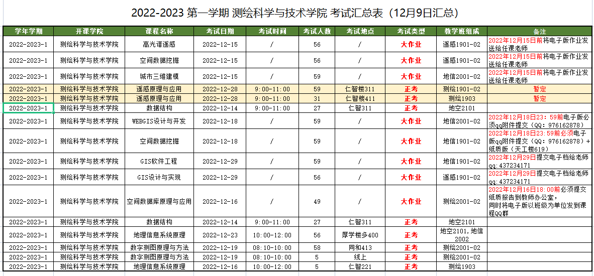 2022-2023 第一学期 yL23411永利官网登录 考试汇总表(12月9日汇总)